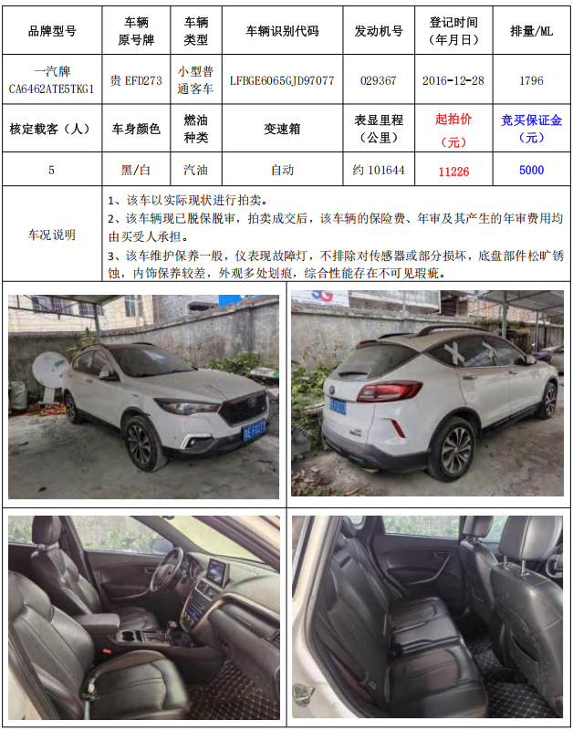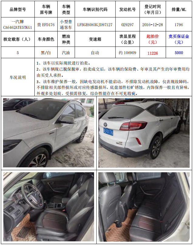 拍品編號1:一汽牌CA6462ATE5TKG1小型普通客車1輛(車輛原號牌:貴EFD271)