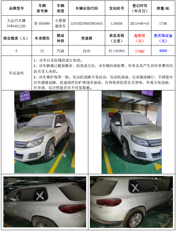 拍品編號7:大眾汽車牌SVW6451JED小型普通客車1輛(車輛原號牌:貴E90689)